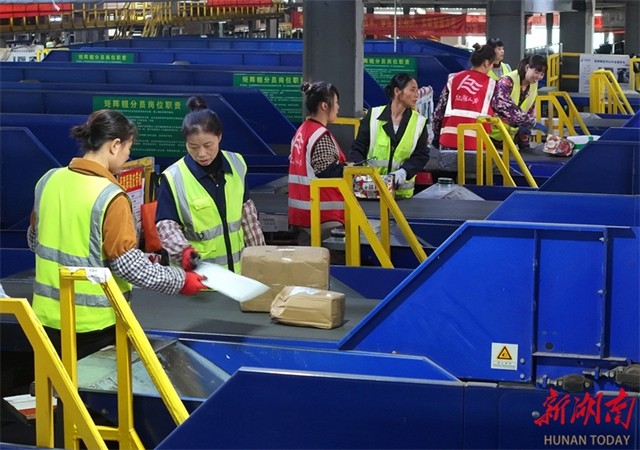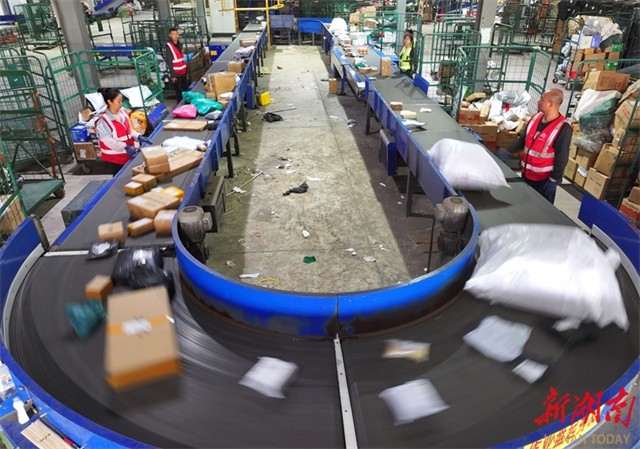 Staff members are busy sorting express parcels on the conveyor belt at the mail processing center of the Hengyang Postal District Center of China Post Group Co., Ltd. Multiple e-commerce platforms have launched concentrated promotional campaigns since the beginning of this month, bringing a small peak in delivery volume for logistics departments. The center has implemented a rotating shift system to ensure that express parcels will be sorted immediately upon arrival. (Photo/Cao Zhengping and Xu Fang)